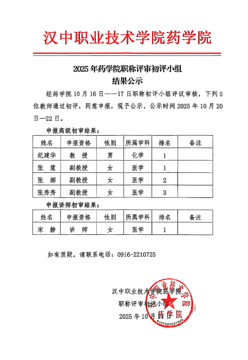 经药学院10月16日——17日职称初评小组评议审核,下列5位教师通过初评,同意申报,现予公示,公示时间2025年10月20日—22日。