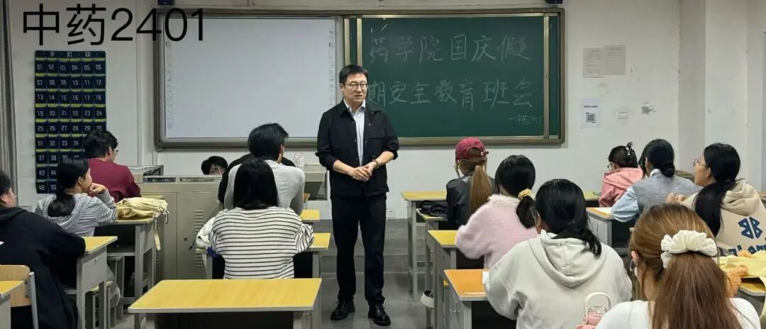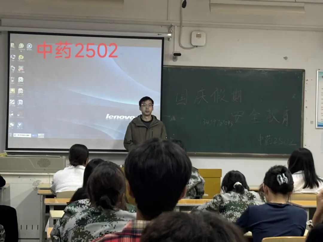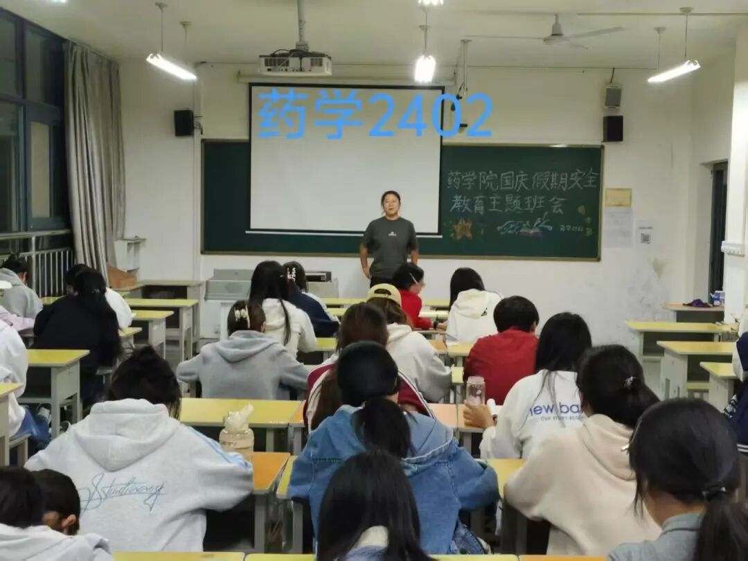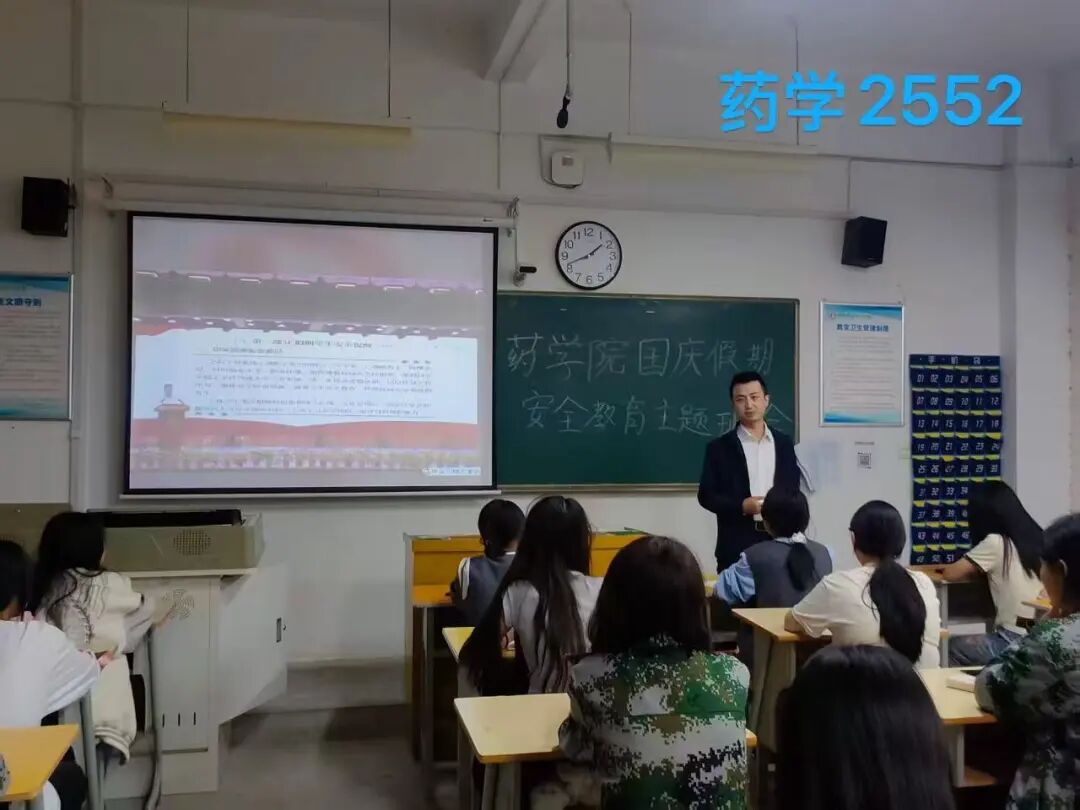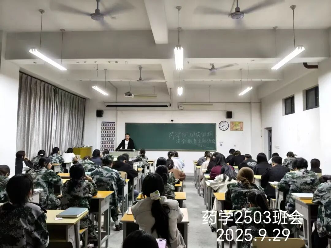 为进一步强化校园安全管理、增强学生安全意识,确保国庆假期学生的安全和健康,切实做到“五个一”工作要求,全面落实“七个到位”与“八个有”工作标准。2025年9月29日晚,药学院以线上线下相结合的形式,组织召开“2025年国庆假期安全教育”主题班会,全体学生(含实习学生)及学生家长同步参会,共同为假期安全“保驾护航”。