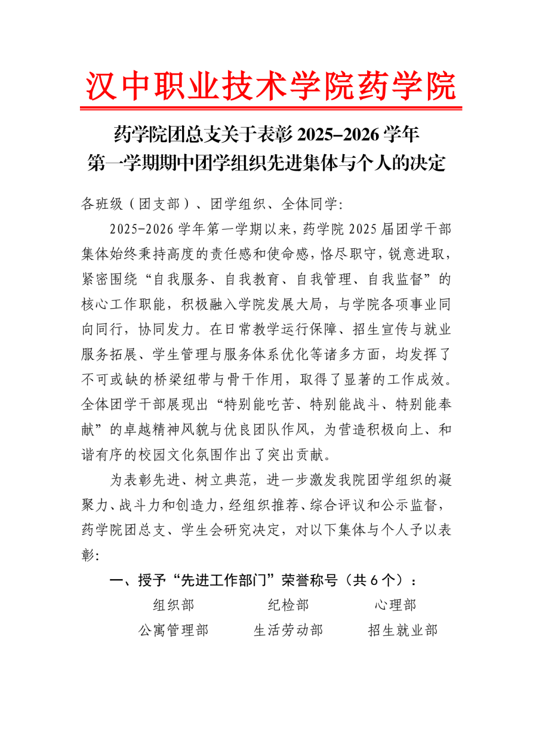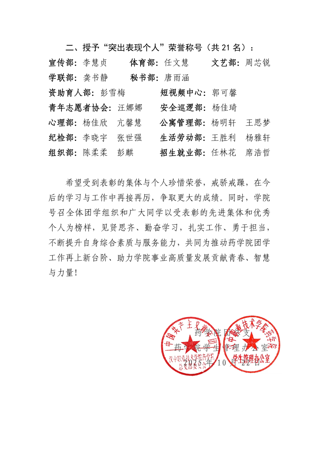 王瑶宣读了《药学院团总支关于表彰2025-2026学年第一学期期中团学组织先进集体与个人的决定》,对表现突出的集体与个人予以表彰,树立先进典型,营造争先创优的良好氛围。