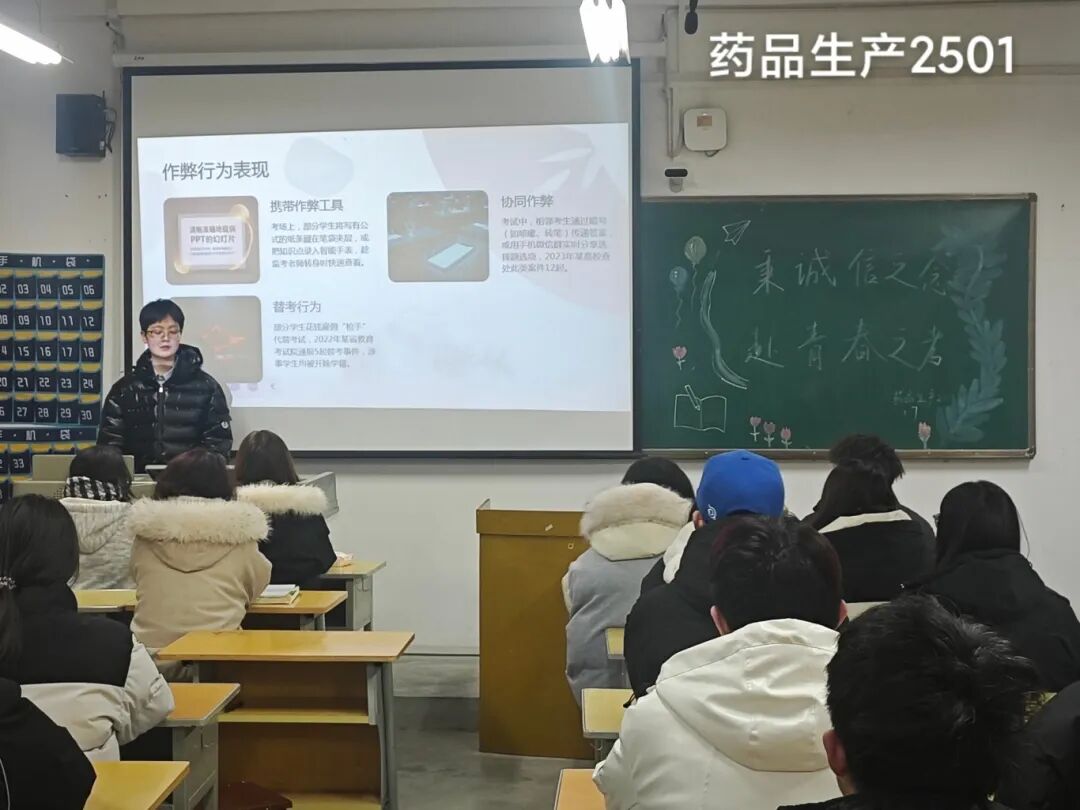 会上,各班团支书带头领学学校考试管理规章制度,并结合《学生手册》具体条款与相关警示案例,对考试纪律要求、违纪后果及诚信应考的重要意义进行了清晰阐释与深入解读。团支书强调,诚信是立身之本、求学之基,期末考试不仅是对知识掌握程度的检验,更是对青年学生道德品格的一次重要锤炼。全体同学应从维护考试严肃性与公平性出发,自觉抵制任何违规念头,将诚实守信内化为价值追求,外化为自觉行动。