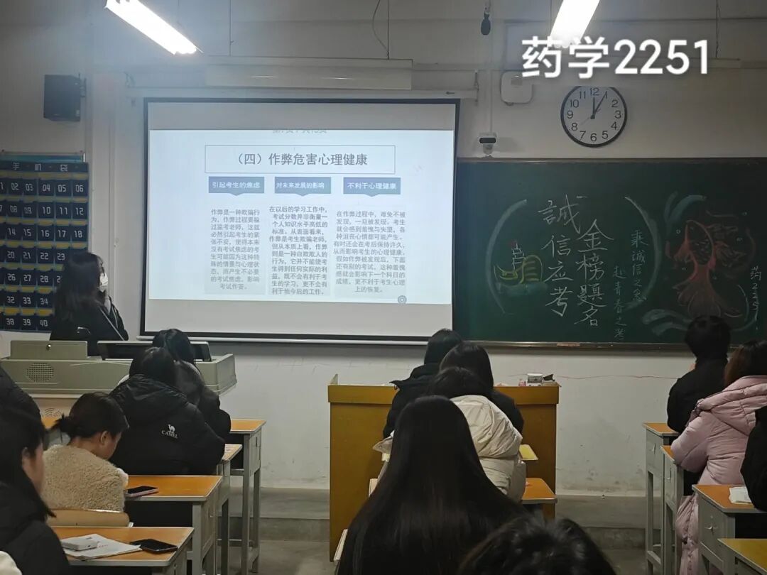 在交流研讨环节,同学们围绕“如何科学备考”“如何调适心态”“如何在实践中坚守诚信”等议题踊跃发言。多位同学结合自身复习计划与学习体会,分享了高效备考方法与时间管理经验;部分学生代表主动谈及对诚信价值的理解,表达了从我做起、严于律己、共同维护公平考试环境的坚定决心。现场气氛热烈,互动积极,展现了药学院学子勤学慎思、明辨笃行的精神风貌。