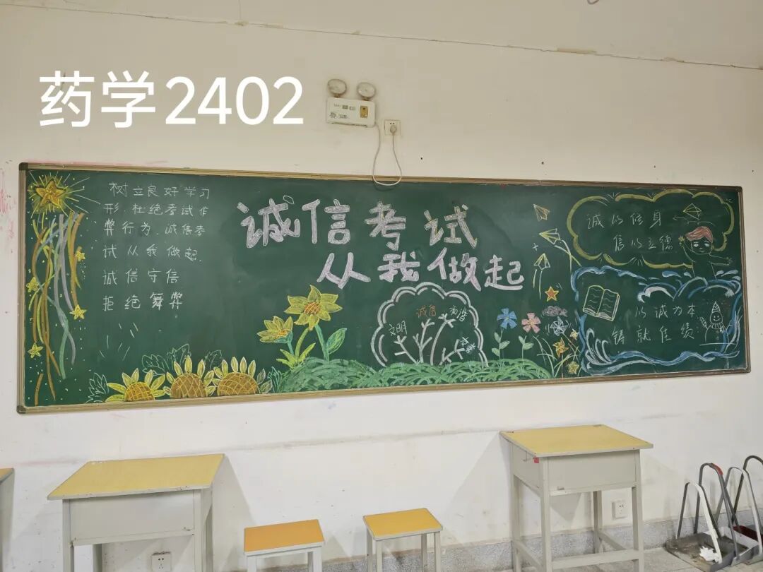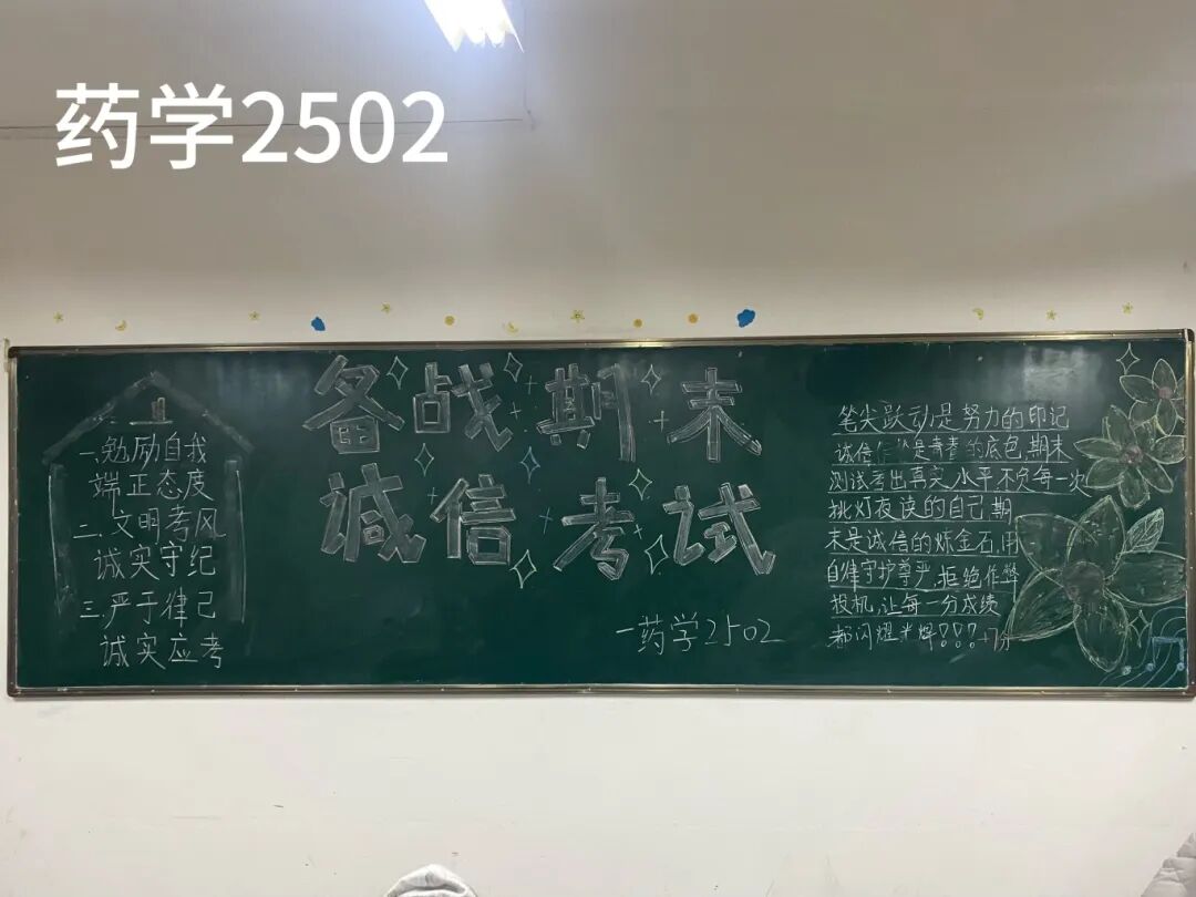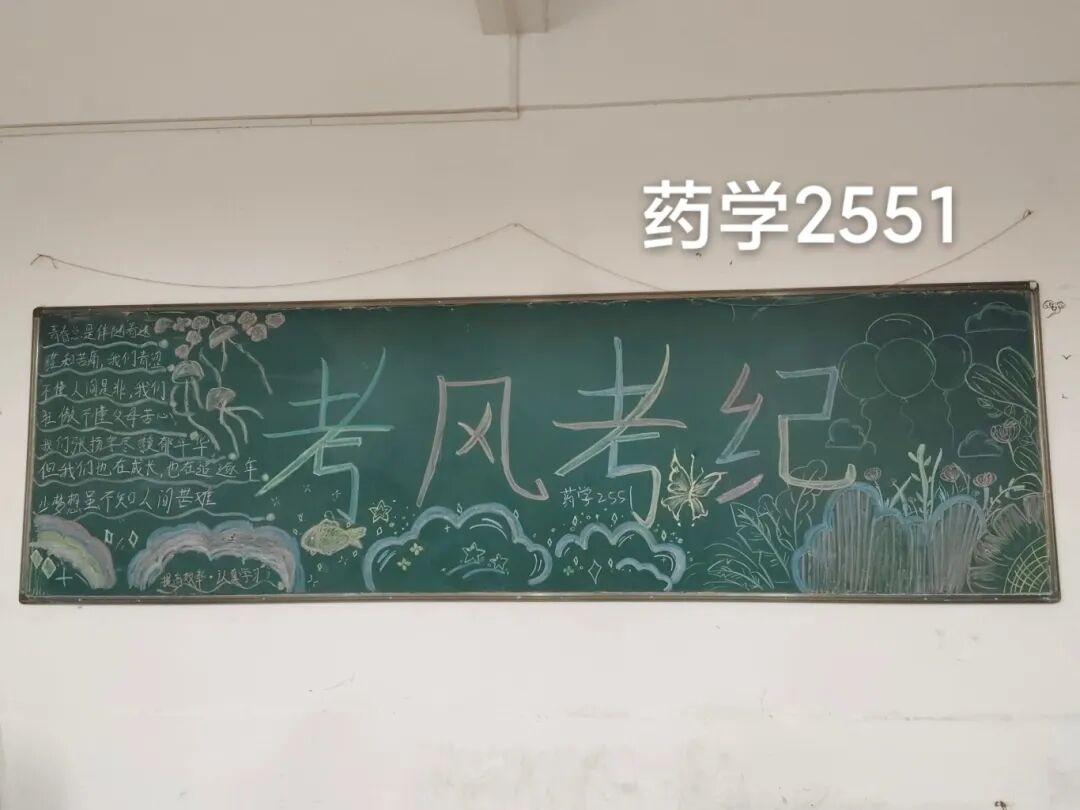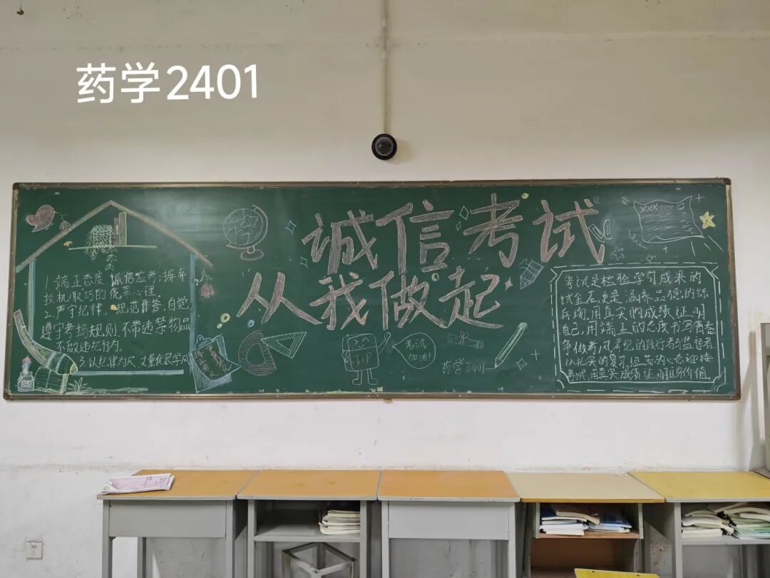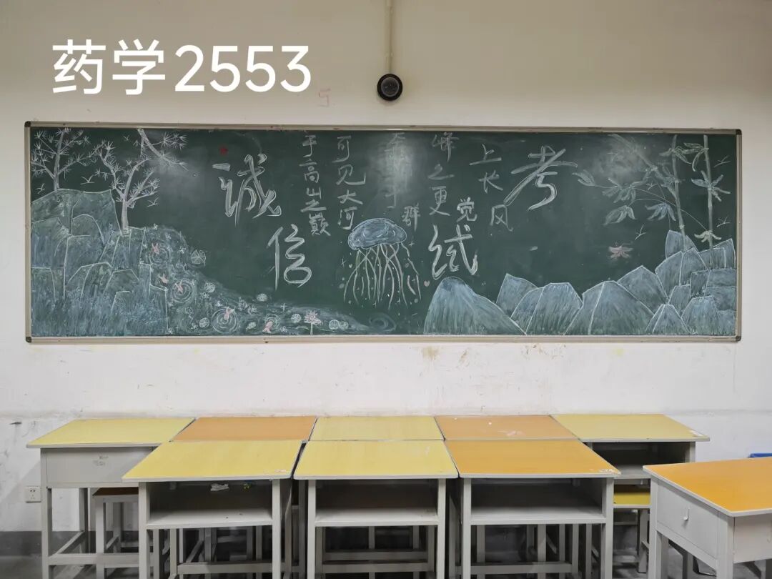 诚信是求学最珍贵的基石,在考试月到来之时,为弘扬诚信风尚,激发创意表达活力,营造清正严谨的考试环境,厚植学生求真务实的素养,药学院组织开展“诚信守考纪,清风伴学途”主题黑板报创作活动。