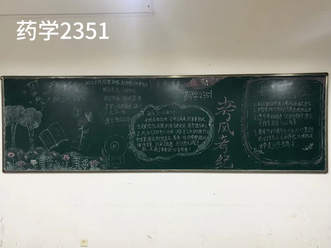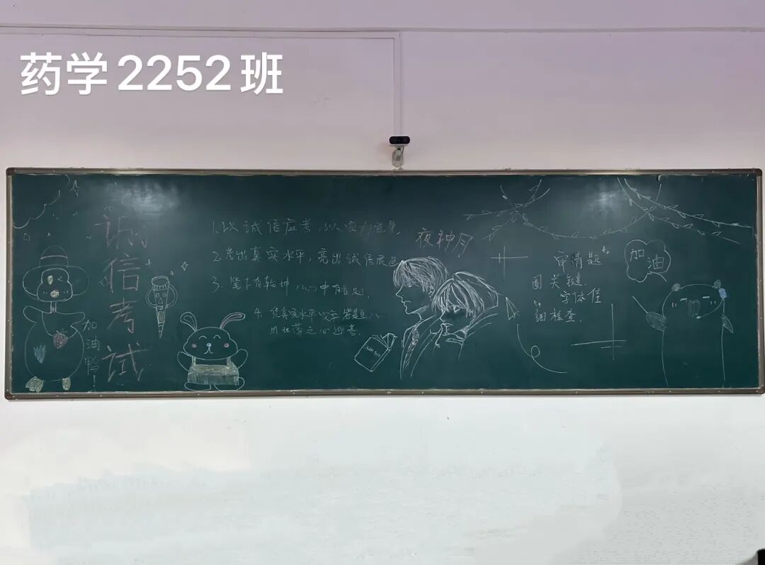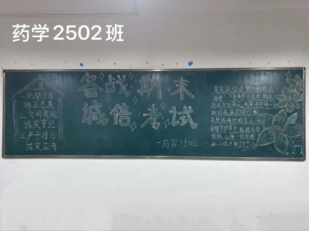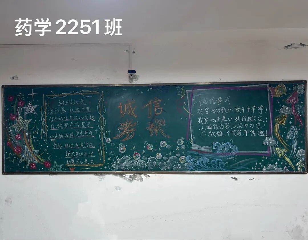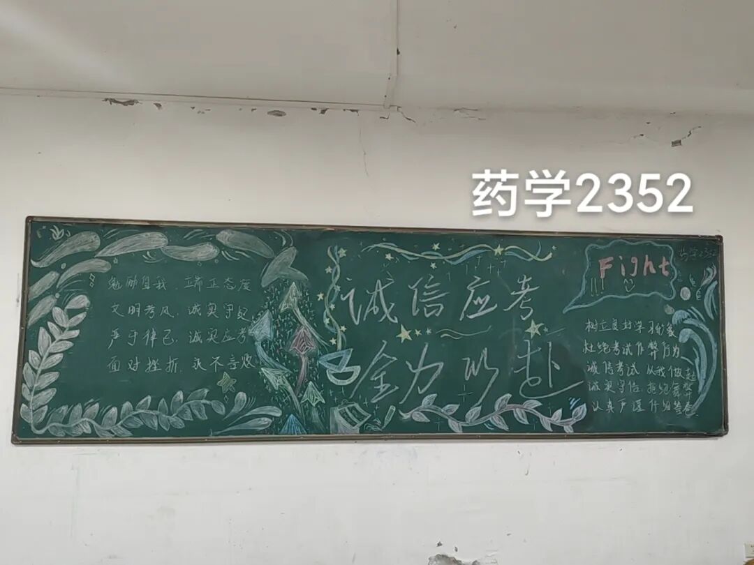 诚信是求学最珍贵的基石,在考试月到来之时,为弘扬诚信风尚,激发创意表达活力,营造清正严谨的考试环境,厚植学生求真务实的素养,药学院组织开展“诚信守考纪,清风伴学途”主题黑板报创作活动。