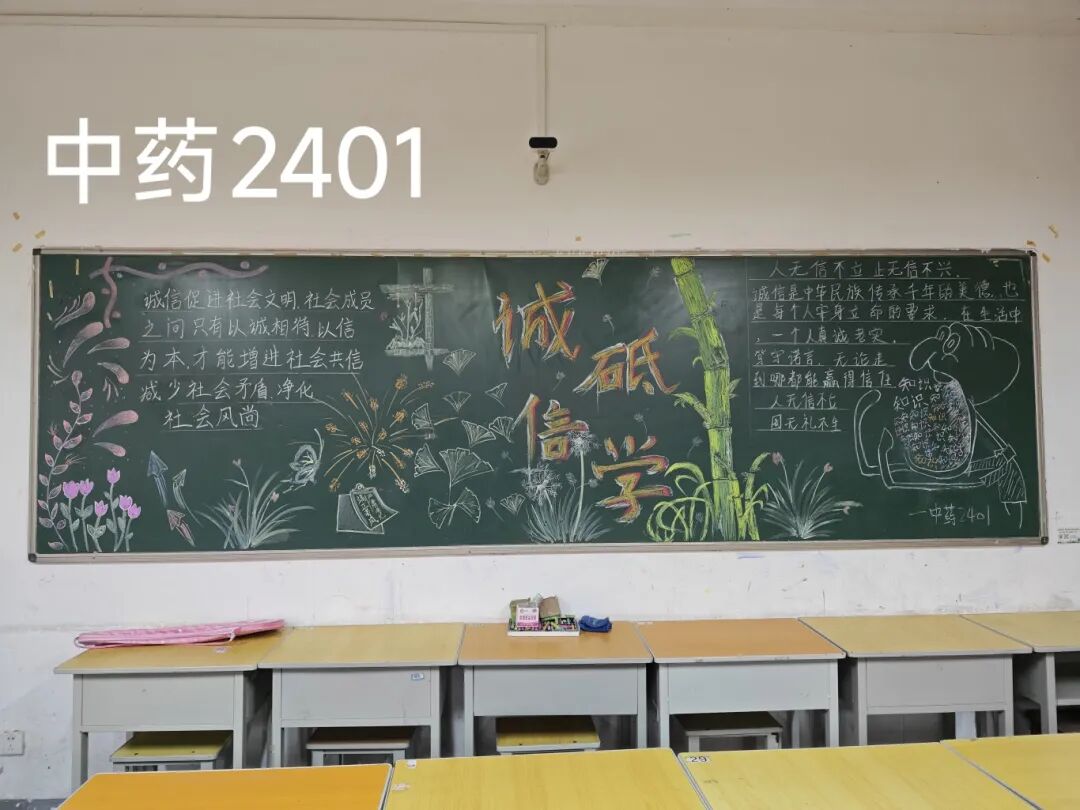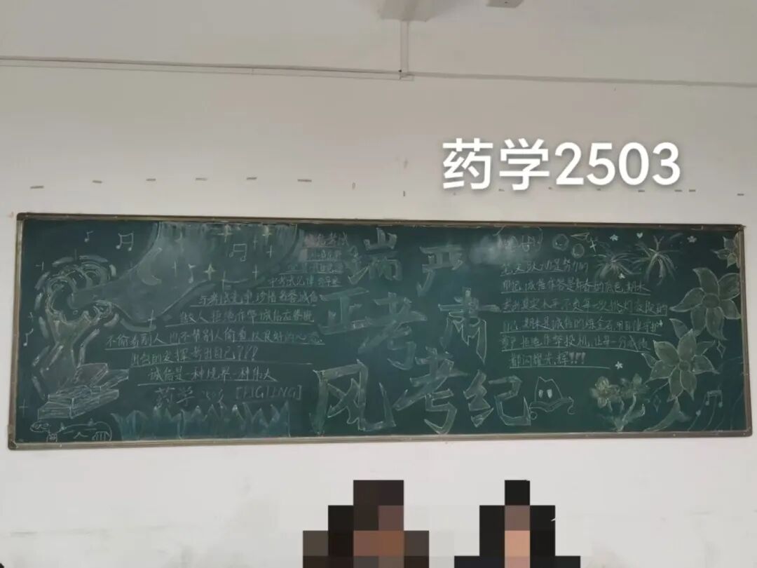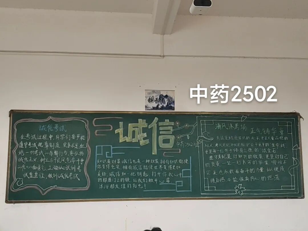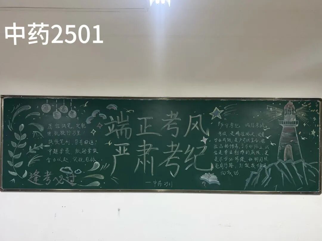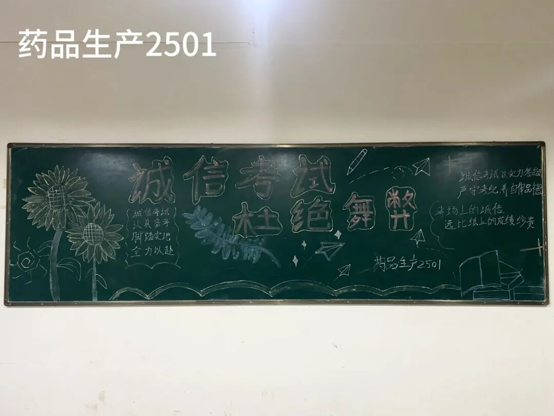 诚信是求学最珍贵的基石,在考试月到来之时,为弘扬诚信风尚,激发创意表达活力,营造清正严谨的考试环境,厚植学生求真务实的素养,药学院组织开展“诚信守考纪,清风伴学途”主题黑板报创作活动。