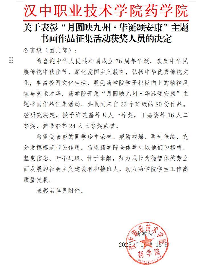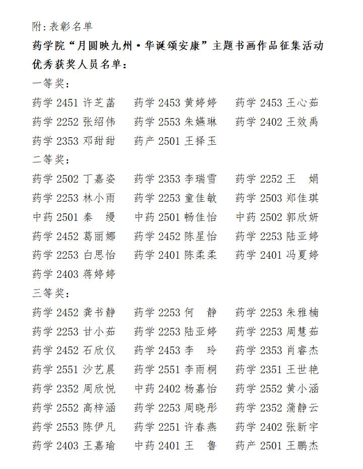 药学院关于表彰“月圆映九州·华诞颂安康”主题书画作品征集活动获奖人员的决定