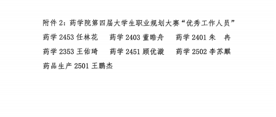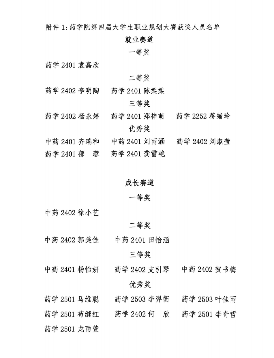 为贯彻落实党中央、国务院和省委、省政府关于高校毕业生就业工作的决策部署,根据《教育部关于举办第三届全国大学生职业规划大赛的通知》(教学函〔2025〕2号)精神。以择业新观念打开就业新天地,强化高校生涯教育和就业指导,增强大学生职业规划意识,指导其通过学习实践提升综合素质和能力,促进药学院毕业生高质量充分就业。经过班级初赛、班主任推荐,共有24名选手进入药学院复赛。2025年11月26日药学院举办第四届大学生职业规划大赛复赛,经综合评定,决定授予袁嘉欣等2人一等奖,陈柔柔等5人二等奖,杨永婷等7人三等奖,刘淑莹等10人优秀奖,任林花等7人“优秀工作人员”。